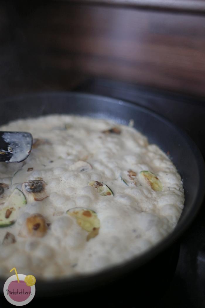 Sillä aikaa kun pasta kiehuu, pese ja viipaloi sienet. Murskaa valkosipulit ja pilko sipuli (ja kesäkurpitsa). Kuullota nämä kaikki kuumalla pannulla, kunnes varsinkin sienet saavat väriä molemmilta puolilta.