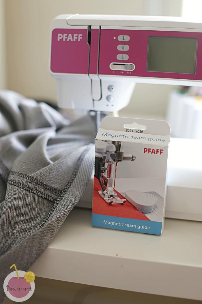 - Silittäessäsi olet toki jo mitannut helman käänteen joka kohdassa yhtä leveäksi. Ompelussa avuksi voit toki ottaa niin yleensä koneen mukana tulevan ohjaimen, tai käyttää kätevää magneettista ohjainta. Itse kokeilin tätä jälkimmäistä vasta ensimmäisen kerran, ja oli muuten kätevä!