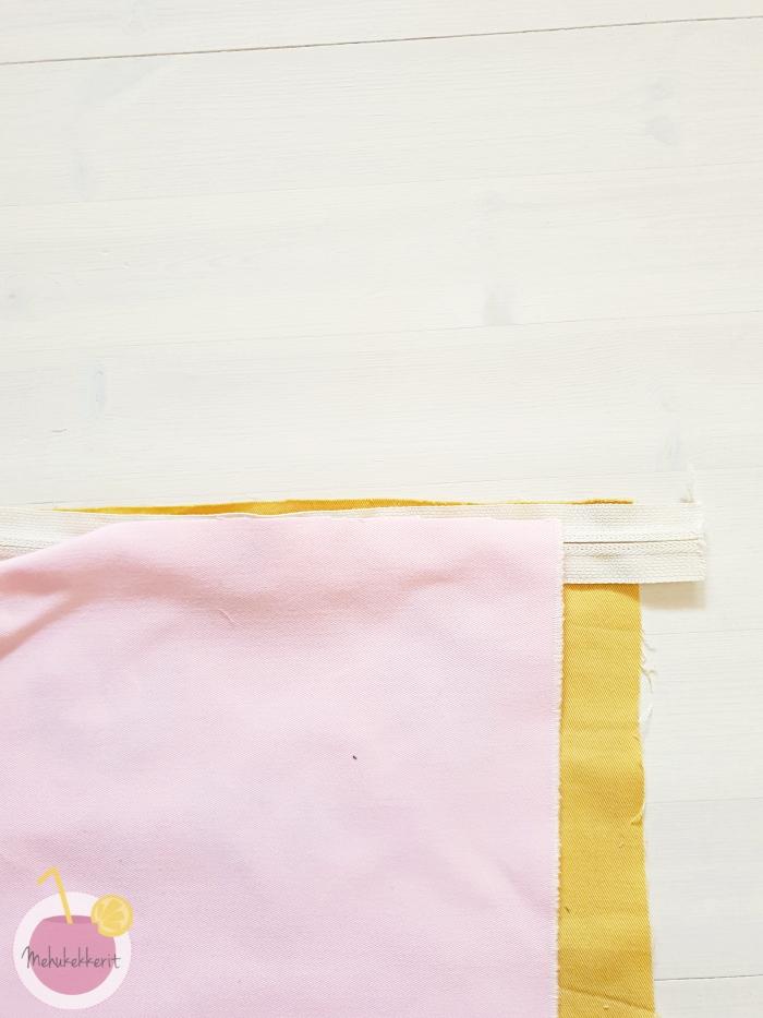 - Käännä ommeltu pala nurinpäin, siten että vetoketju jää nurjalle.