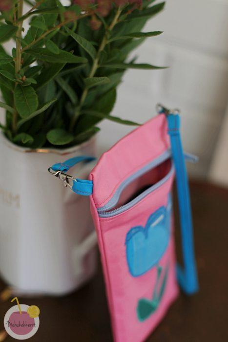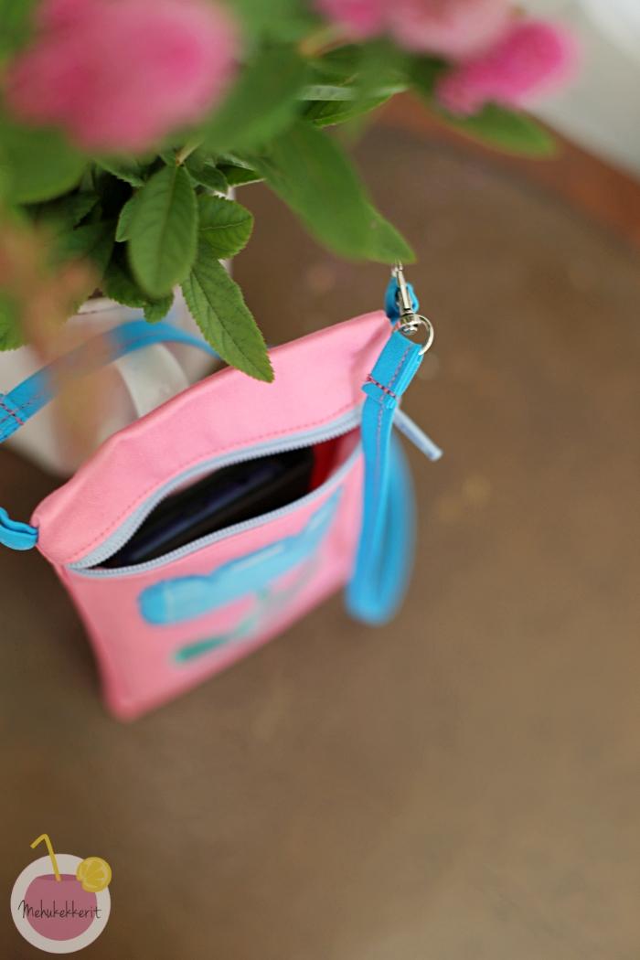 Penaalin lisäksi lapsi tarvitsi myös oman pussukan kännykälleen. Puistoissa ja ulkona muuten menossa puhelin harvoin mahtuu taskuun, eikä kesävaatteissa niitä taskujen juuri ole edes ollut. Ja kuten penaalinkin, suunnitteli lapsi myös tämän pussukan.