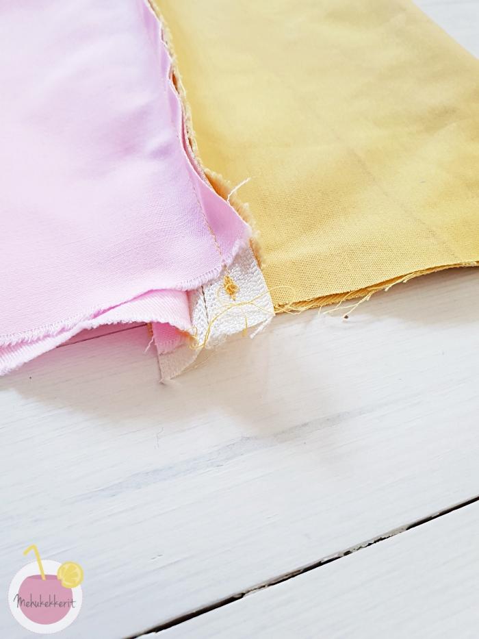 - Silitä, ja tikkaa vielä vetoketjun reunasta suoralla ompeleella kankaat pysymään paikoillaan.