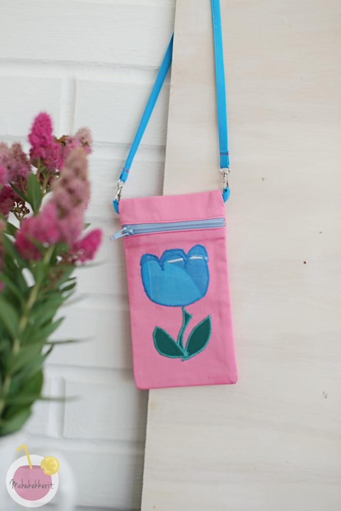 Penaalin lisäksi lapsi tarvitsi myös oman pussukan kännykälleen. Puistoissa ja ulkona muuten menossa puhelin harvoin mahtuu taskuun, eikä kesävaatteissa niitä taskujen juuri ole edes ollut. Ja kuten penaalinkin, suunnitteli lapsi myös tämän pussukan.
