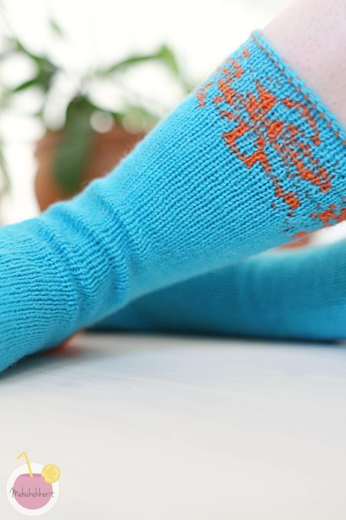 Kirjoneuleessa kannattaa huomioida myös pitkät langanjuoksut. Itse tein vähän liian kireän sukan varren, mutta neulekuvio näkyy siitä silti ihan ok. Löysemmässä mallissa näkyisi toki vielä paremmin.