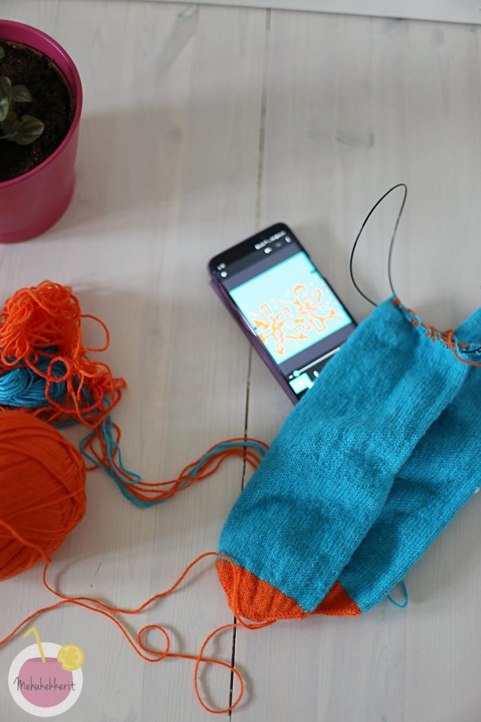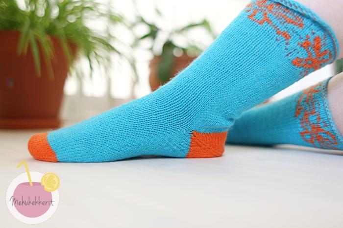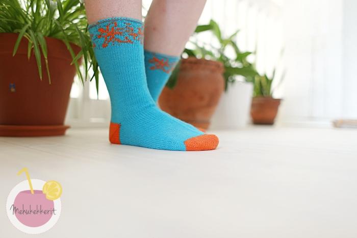 Nämä sukat olivat sukkalahjakortin sukat. Ne menivät siis lahjaksi, ja lahjakortin saaja oli itse suunnitellut sukat. Minä vain toteutin tuon kukkakuvion ja neuloin sukat kaapista löytyvillä langoilla.