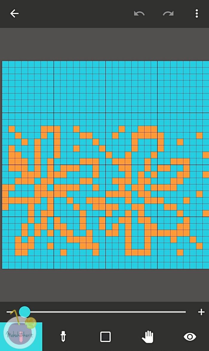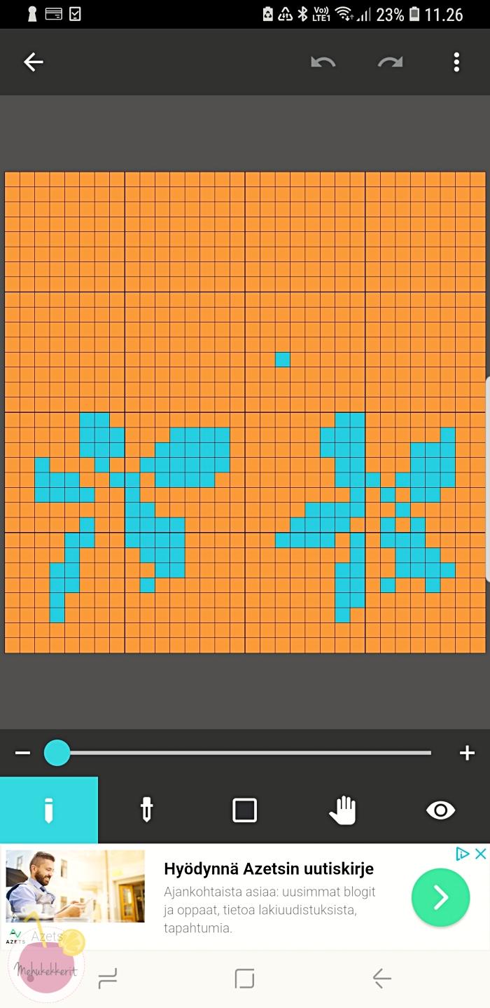 Kirjoneuleeseen löysin kuitenkin joku aika sitten kätevän ohjelman kännykkään. Tällä ohjelmalla kuvion saa tehtyä näppärästi vaikka omasta kuvasta tai piirrettyä suoraan kännykän ruudulle.