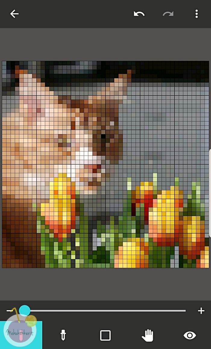 Näitä ohjelmia on varmasti useita. Itse käytän ohjelmaa nimeltä 8bit Painter. Se asennetaan siis ilmaisohjelmana omaan puhelimeen. Siihen voi ladata oman kuvan, joka muokkaa kuvan haluamallesi pikseli-, eli kuviomäärälle, tai vaihtoehtoisesti kuvion voi piirtää itse haluamalleen koolle.