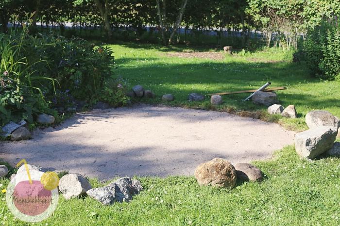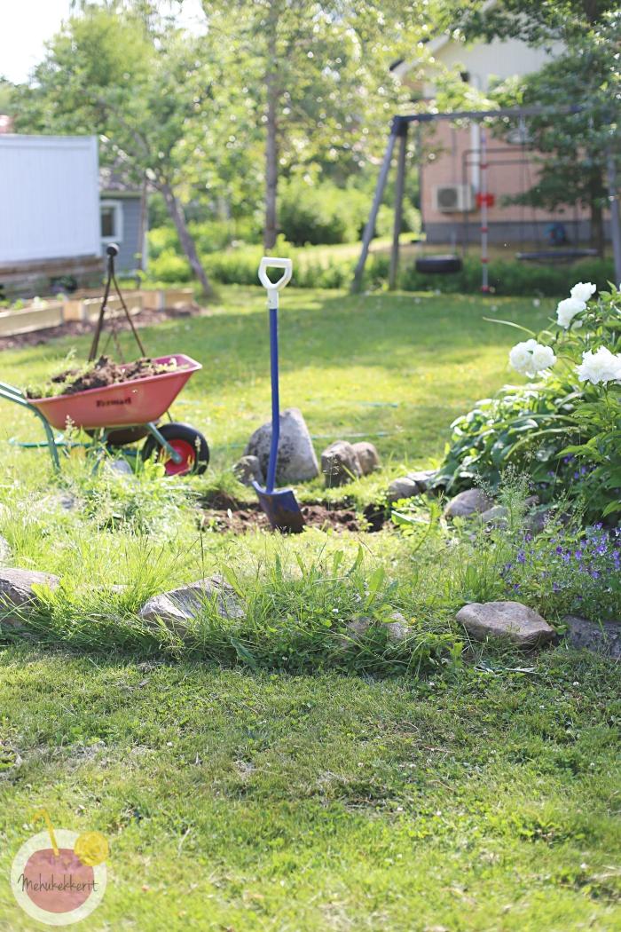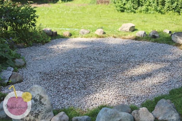 Teimme tulisijalle tilaa pihan keskellä olevan perennapenkin viereen. Siinä sattui olemaan tarpeeksi tasainen kohta sekä kiviä jo valmiiksi. Kaivoimme siis ensin nurmikon pois, tasoitimme, levitimme päälle hiekkaa ja vielä kerroksen soraa.