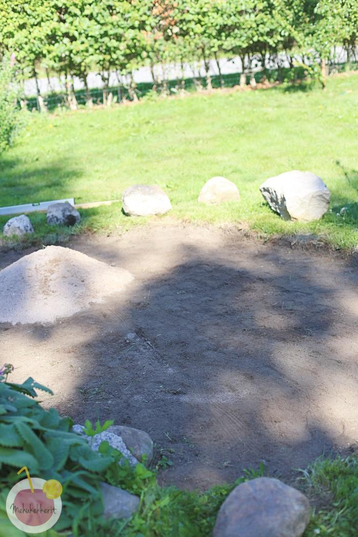 Teimme tulisijalle tilaa pihan keskellä olevan perennapenkin viereen. Siinä sattui olemaan tarpeeksi tasainen kohta sekä kiviä jo valmiiksi. Kaivoimme siis ensin nurmikon pois, tasoitimme, levitimme päälle hiekkaa ja vielä kerroksen soraa.