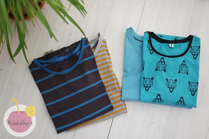 Tällä kertaa paitojen pääntien resorit olivat niin kuluneet, että koin parhaimmaksi leikata vanhat resorit kokonaan pois. Ihan täysin samoja resoreita ei löytynyt enää laatikostani, joten uudet resorien värit poikkeavat hieman vanhoista.