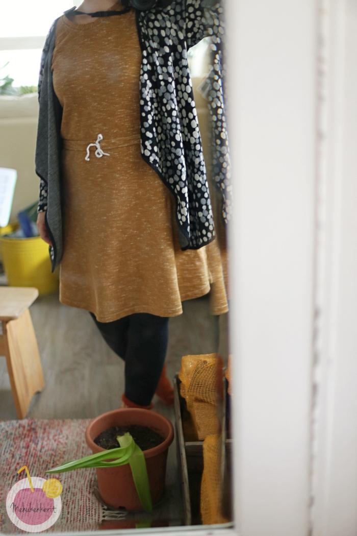 Nyt aion siis pitää päälläni tätä lämmintä neuletakkia, jonka olen ommellut noin kolme vuotta sitten. Neuletakin kaverina on puuvillainen mekko, jonka taas ompelin pari vuotta sitten NOSHin ostomekon inspiroimana. Ja näiden kaverina vielä villasukkahousut.