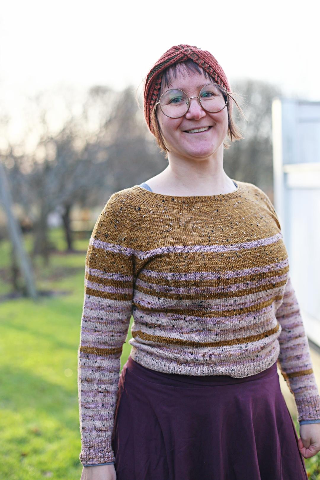 Kaunis ja monikäyttöinen raitapaita! Raidoilla voi leikitellä oman maun mukaan, tai noudattaa ohjeen värikaaviota. Paitaa voi soveltaa myös muille langoille, ja ohut lanka tekee paidasta monikäyttöisen peruspaidan. Paita neulotaan pyörönä ylhäältä alas kaarrokepaitana.